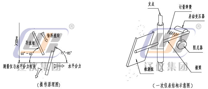干燥的散裝固體物料自由落體沖擊到傳感檢測板(沖板)上后,傳感檢測板產生機械偏移。然后散裝物料流連續(xù)而無阻礙的通過。即:由于沖擊力與傳感檢測板具有一定角度,故該力分解成一個水平分力和一個垂直分力。垂直分力由變送器的機械結構克服而不起作用,而水平分力有一個差動傳感器(線性可調差動變送器),這個信號經與之相連的積算儀檢測和處理,得出瞬時流量和累積流量。