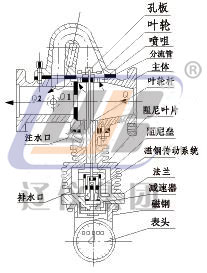 流量計是按節(jié)流元件,分流原理設計制造的;被測蒸汽進入流量計主體后分為兩路,一路Q1通過節(jié)流孔板(此部分蒸汽不作計量),在孔板兩側產生壓差△P,在此壓差作用下,另一路Q2流經(jīng)噴嘴噴射在葉輪上,葉輪軸轉動。為減慢葉輪軸轉速,葉輪軸下方按有阻尼葉片并浸沒在阻尼室內水中。由于兩路有同一壓差△P,在規(guī)定流量范圍內,根據(jù)流體相似原理,兩路蒸汽流量Q1和Q2之間的比例關系基本為常量,這樣只要測出流經(jīng)噴嘴部分的流量Q2,即可知總流量Q。